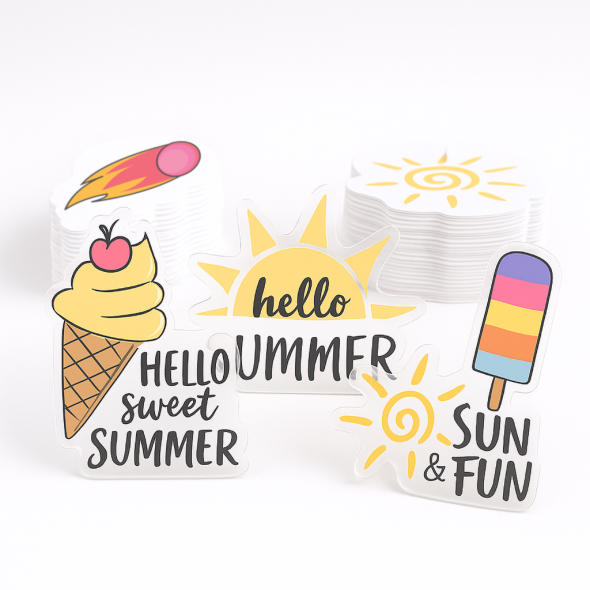 .002 Décalques Formes Spéciales Polyester Transp. / adhésif haute performance pour usage intérieur (1 à 4 pouces carrés). Quadrichromie numérique haute résolution, blanc inclus, toutes marges perdues.