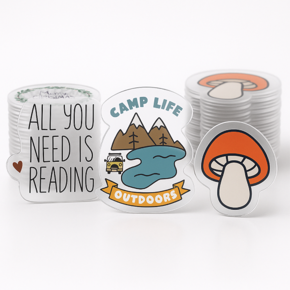.004 Décalques Formes Spéciales Vinyle Transp. / endos adhésif amovible pour usage intérieur (1 à 4 pouces carrés) Quadrichromie