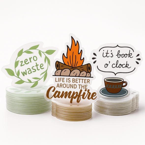 .0015 Décalques Formes Spéciales Polyester Transp. Luisant / endos adhésif std pour usage extérieur (1 à 4 pouces carrés). Impression numérique en quadrichromie haute résolution, blanc inclus, toutes marges perdues.
