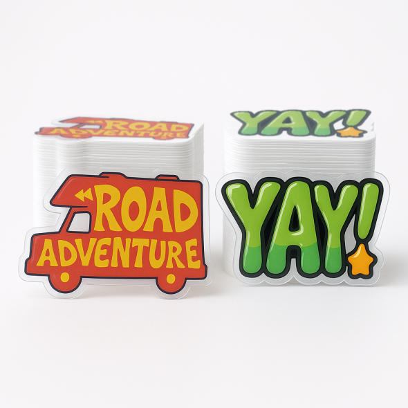 .002 Décalques Formes Spéciales Polyester Transp. Luisant / adhésif haute performance pour usage extérieur (1 à 4 pouces carrés). Impression numérique en quadrichromie haute-résolution, blanc inclus, toutes marges perdues.